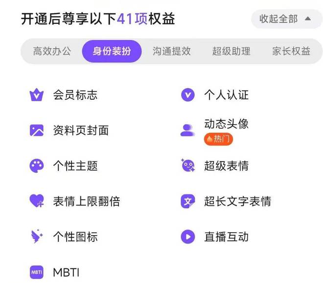 钉钉的外观类权益遍及了个人资料页、头像、表情、APP主题及图标、直播间等各类场景,甚至钉钉会员能在个人页展示MBTI性格测试结果。如果只看外观类权益,钉钉要比夸克更像to C产品。