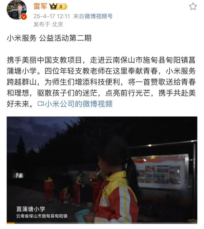 雷军今日午间更新微博,宣传小米服务的公益活动。雷军称:“携手美丽中国支教项目,走进云南保山市施甸县甸阳镇菖蒲塘小学。四位...    雷军今日午间更新微博,宣传小米服务的公益活动。