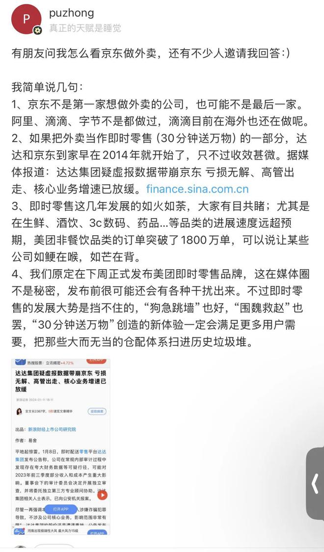 需要指出的是,王莆中还提及了京东旗下的达达,“如果把外卖当作即时零售(30分钟送万物)的一部分,达达和京东到家早在2014年就开始了,只不过收效甚微。”