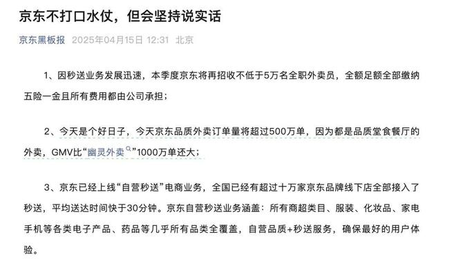 随后,京东方面午间发文称“京东不打口水仗,但会坚持说实话”,除了宣布本季度将再招收不低于5万名全职外卖员,全额足额全部缴纳五险一金且所有费用都由公司承担,京东还表示,今天京东品质外卖订单量将超过500万单,因为都是品质堂食餐厅的外卖,GMV比“幽灵外卖”1000万单还大。