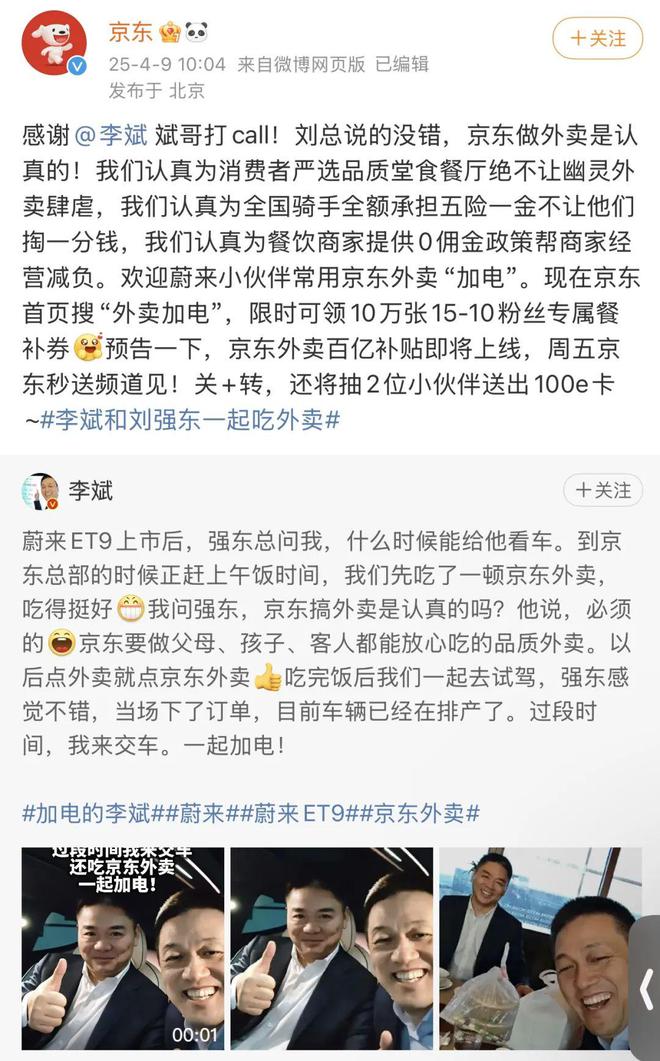 4月9日,蔚来创始人李斌在微博上晒出和刘强东的合影,两人在京东总部吃了一顿京东外卖,李斌问刘强东:“京东外卖是认真的吗?”刘强东回应:“当然了”。
