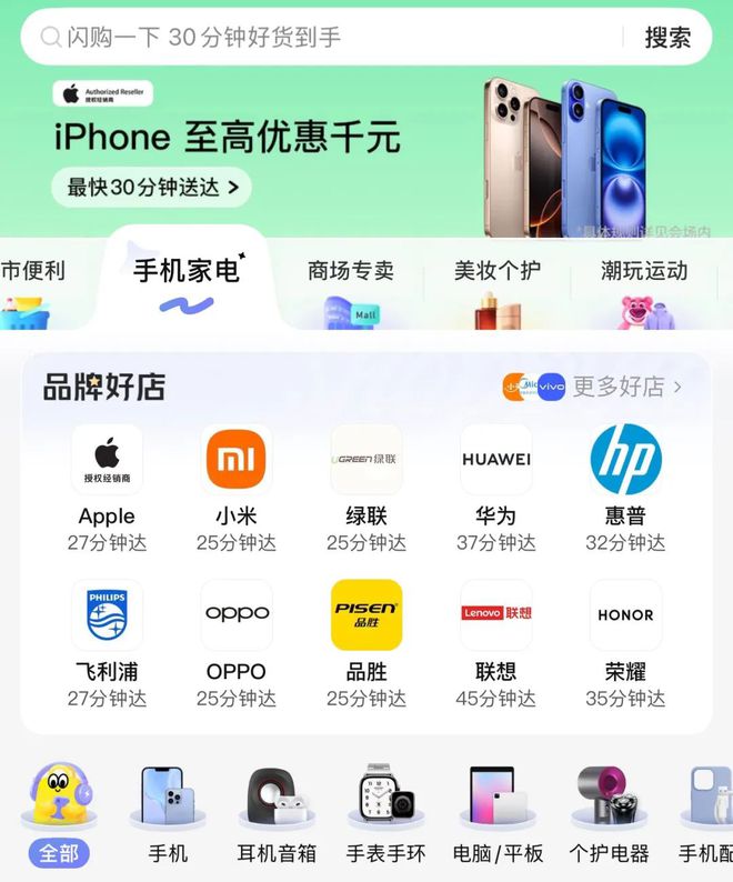 从美团App中“闪购”的类目来看,蔬菜水果、超市便利、手机家电、商场专卖被放在显眼的位置。从消费者的反馈来看,近年来,在外卖平台上购买MUJI产品、iPhone手机已经不是新鲜事。对于手机家电品类,美团闪购给出的配送时效已经达到了分钟级别:苹果27分钟达、小米25分钟达、华为37分钟达。