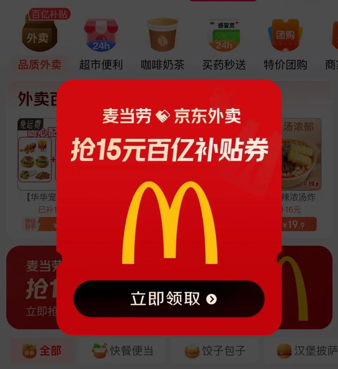 当京东进入2025年的外卖市场,无论是商家还是消费者,都在等待刘强东“撒钱”。4月11日,京东外卖正式上线百亿补贴,进入京东App,外卖入口位于主页秒送频道中的首屏位置,并贴上了显眼的百亿补贴标识。麦当劳满20-15元,Tims、库迪、霸王茶姬等咖啡奶茶品牌满15-10元的补贴券“霸屏”。