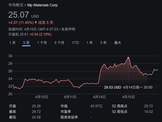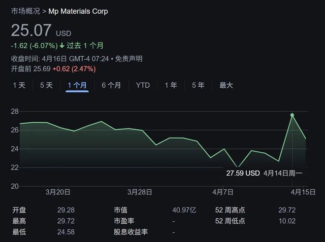 受多重消息刺激,4月14日至16日,MP Materials股价坐上过山车,暴涨后又大幅回吐,截至发稿前报25.07美元/股,虽然回吐后的五日涨幅仍为11.4%,但相较一个月以前大幅下跌。