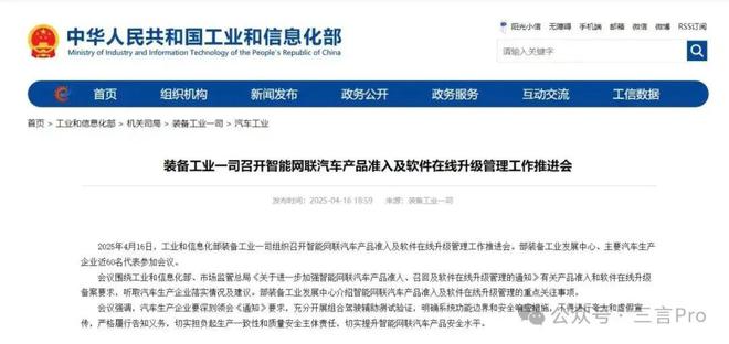 据工业和信息化部官方网站消息,4月16日,该部装备工业一司组织召开智能网联汽车产品准入及软件在线升级管理工作推进会。该部装备工业发展中心、主要汽车生产企业近60名代表参加会议。