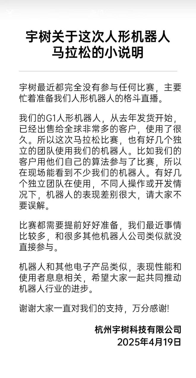 此外,4月19日,宇树科技还针对此次人形机器人半马赛事发布了说明。