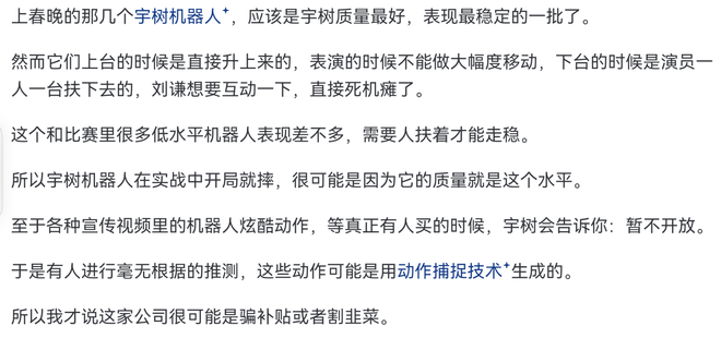 该网友质疑宇树机器人水平并不高,只在“宣传视频”中有炫酷动作,“可能使用动捕技术生成”。