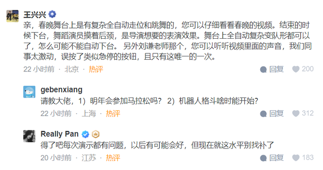 对此,宇树科技CEO在该答案下回复称,“亲,春晚舞台上是有复杂全自动走位和跳舞的,您可以仔细看看春晚的视频。结束的时候下台,舞蹈演员摸着后颈,是导演想要的表演效果。舞台上全自动复杂变队形都可以了,怎么可能不能自动下台。 另外刘谦老师那个,您可以听听视频里面的声音,我们同事太激动,误按了类似急停的按钮,且只有这唯一的一次。”