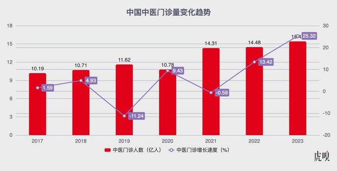 中医历来有“上医治未病”的说法,在大众越来越注重健康的今天,其需求量也有快速增长的趋势。行业统计数据显示,2022年以来,医疗机构中医门诊的增长速度都在10%以上,2023年超过了25%,服务总量也达到了近百万亿人,远超此前水平。中医馆、中医诊所注册数也在快速飙升。