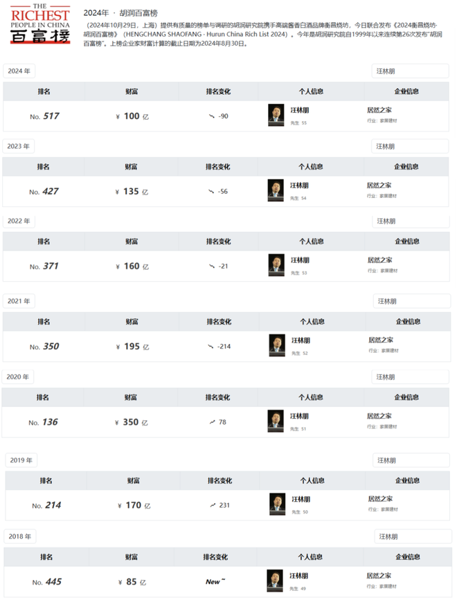 源媒汇查询胡润百富榜发现,自2018年开始,汪林朋连续7年上榜。其中,2020年其身家达到350亿元巅峰,之后不断缩水。2024年,汪林朋以百亿身家位列胡润百富榜第517位。