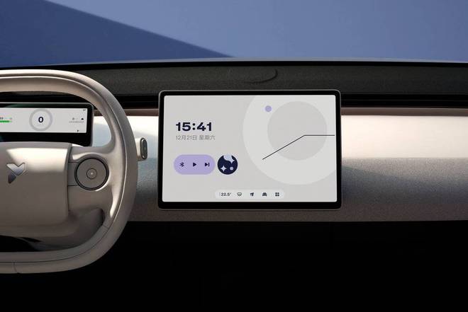 抛开车灯设计,萤火虫在车辆造型、座舱、UI 界面设计上协同度较高。三重奏大灯、灵动尾环、荧光胶囊贯穿整车设计,其在车机UI设计同样采用了圆形、胶囊型的设计,车内外的设计风格高度统一。