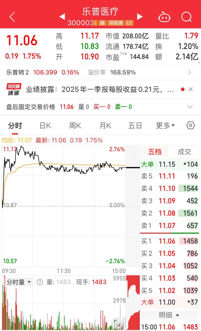 截至4月21日,乐普医疗报收11.06元,涨1.75%。