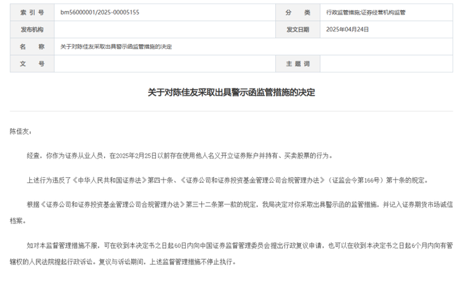 4月24日,湖南证监局披露了一则《关于对陈佳友采取出具警示函监管措施的决定》的公告。