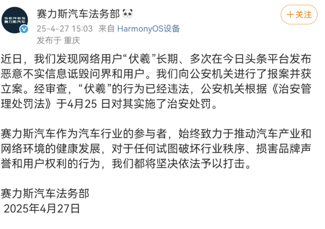 4月27日赛力斯法务部发文称,近日,赛力斯发现网络用户“伏羲”长期、多次在今日头条平台发布恶意不实信息诋毁问界和用户。公司向公安机关进行了报案并获立案。经审查,“伏羲”的行为已经违法,公安机关根据《治安管理处罚法》于4月25 日对其实施了治安处罚。