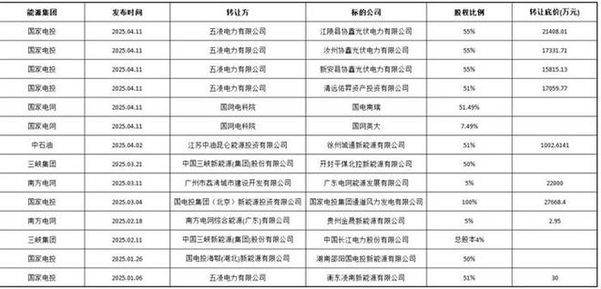 进入2025年以来,央企抛售新能源资产的步伐仍在提速。截至目前,国家电投、国家电网、三峡集团、南方电网、中石油五家能源央企发布了14条转让信息。