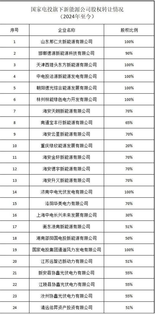 2024年7月,国家电投提出"均衡增长战略",通过存量提质和增量做优均衡推进。此后,公司实施了多次资产重组,并频繁挂牌旗下资产产权。据不完全统计,2024年至今,国家电投共转让旗下24家新能源公司股权。