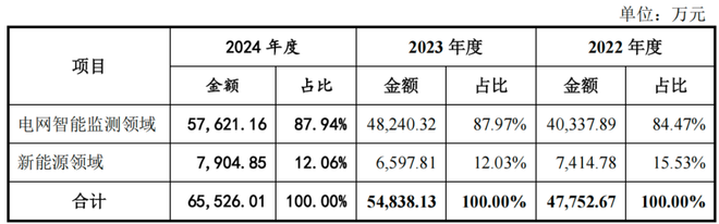2022年至2024年(报告期),山大电力营业收入分别为4.78亿元、5.49亿元和6.58亿元,复合增速超17%,电网智能监测领域收入平均占比超85%,其余由新能源领域收入贡献。