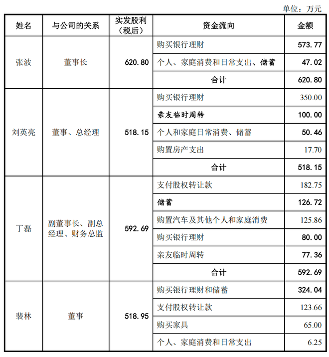 据一轮问询函,2020年至2023年上半年,张波、梁军、丁磊、李欣唐等高管分别获得合计620.8万元、518.15万元、592.69万元、520.91万元股利(税后)。