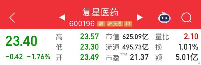 二级市场方面,截至4月30日收盘,复星医药报收23.4元,跌1.76%。
