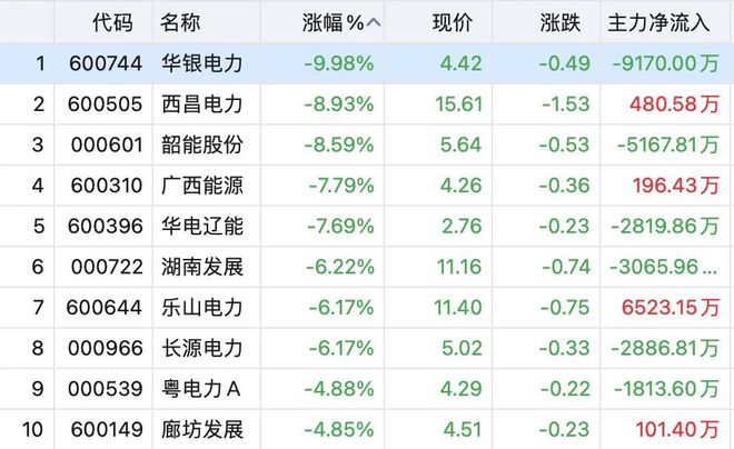 此外,电力板块亦表现低迷,华银电力尾盘跌停,西昌电力、韶能股份、广西能源跌幅居前。