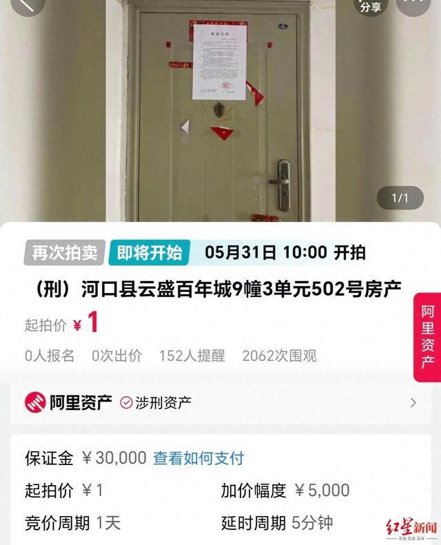 5月5日,红星新闻记者从淘宝网司法拍卖网络平台注意到,位于云南河口县一套建筑面积150.56㎡的住宅将被司法拍卖,起拍价仅为1元,目前尚无人报名。