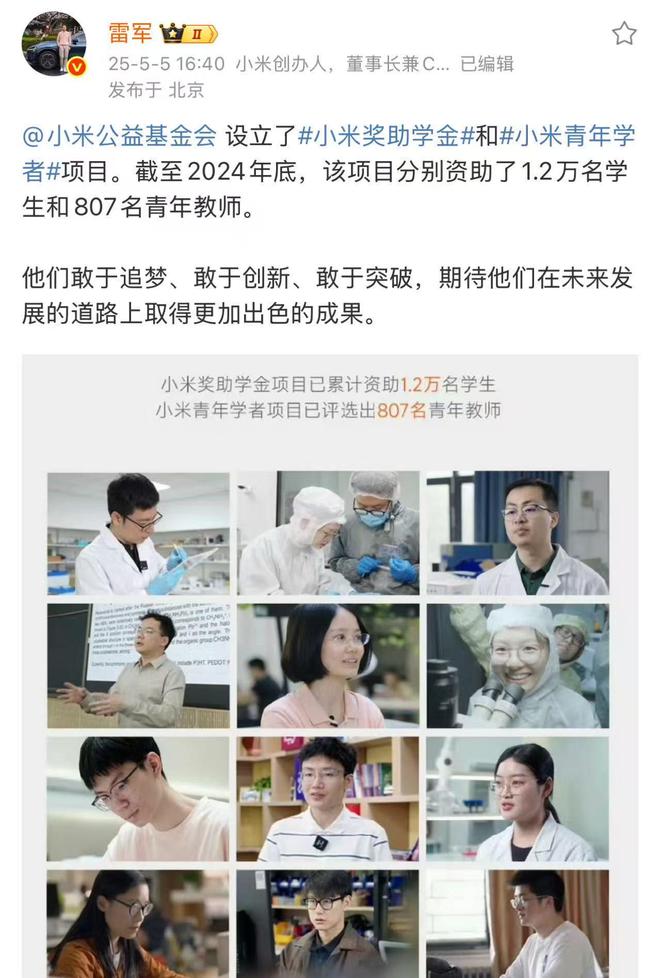 雷军:小米公益基金会资助了1.2万名学生和807名青年教师 访客 2025-05-05 19:23:06 139 默认 摘要: 雷军今日发文称,小米公益基金会设立了“小米奖助学金”和“小米青年学者”项目。截至2024年底,该项目分别资助了1.2万名... 雷军今日发文称,小米公益基金会设立了“小米奖助学金”和“小米青年学者”项目。截至2024年底,该项目分别资助了1.2万名学生和807名青年教师。雷军表示,他们敢于追梦、敢于创新、敢于突破,期待他们在未来发展的道路上取得更加出色的成果。 标签: 小米 助学金 海报 阅读 QQ 分享 微博分享 微信分享 分享 上一篇比亚迪:前4月新能源汽车138.09万辆,同比增46.98% 下一篇QuestMobile:智能汽车APP月活0.86亿,小米汽车APP月活414万 比亚迪:前4月新能源汽车138.09万辆,同比增46.98%上一篇 QuestMobile:智能汽车APP月活0.86亿,小米汽车APP月活414万下一篇 相关推荐 小米助学金 曝字节视觉大模型负责人杨建朝内部官宣休息,周畅接任 2025-07-17 杭州成立专班介入处理宗庆后遗产纠纷 2025-07-17 爱康国宾曾因体检漏检被索赔15万 2025-07-17 三兄妹在港起诉宗馥莉文书曝光 2025-07-17 爱康集团回应“女子漏检癌症”事件:将邀请第三方机构及专家分析原因 2025-07-17 2025暑期档总票房破35亿 2025-07-17 美团王莆中:将保证美团骑手收入永远在蓝领第一梯队 2025-07-17 卢伟冰:小米深圳大厦明天正式开园 2025-07-17
