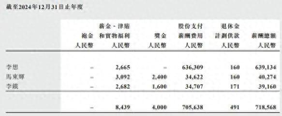 理想汽车2024年年报显示,李想2024年的薪酬构成为:266.5万元的薪金、津贴和实物福利,16万元的退休金计划供款,以及6.36亿元的股份支付薪酬费用,合计6.39亿元。