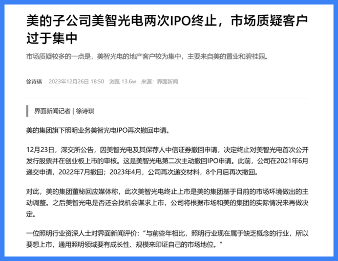 早在2020年,美的就启动分拆旗下照明业务美智光电上市,但可能是太难通过审核了,两次递交申请,又两次主动撤回。当时,界面新闻报道分析了原因: