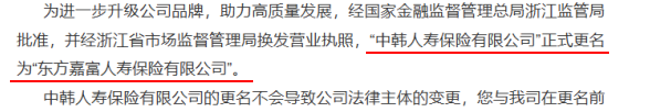 近日,中韩人寿官网显示,正式更名为东方嘉富人寿,同时还表示更名不导致公司法律主体变更。