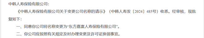 事实上,早在今年1月27日,管理部门就已同意中韩人寿将名称变更为"东方嘉富人寿",并督促其"及时办理变更及许可证换领事宜"。