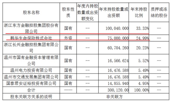 之后,经过几次增资和股权结构变动,公司股东由2家变为7家。到2022年时,浙江东方成为中韩人寿第一大股东,持股33%,而韩华生命持股比例稀释至25%。