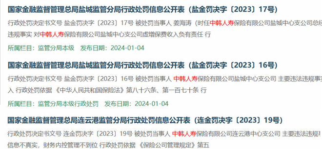 其实,这种情况更早时就已出现,比如仅2024年1月4日这一天,监管部门就发布多起针对中韩人寿旗下机构2023年违规行为的处罚决定。