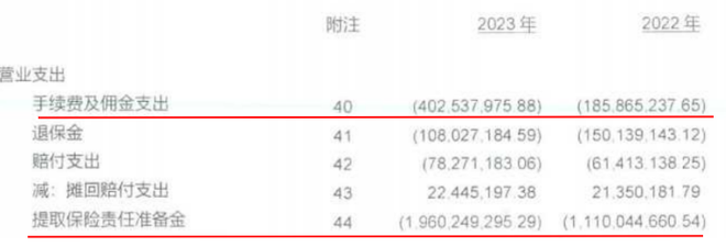 支出方面也负担不小,2022-2023年手续费及佣金支出约6亿元,提取保险责任准备金约31亿,相比2021年分别增长275%、343%。