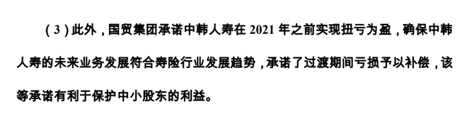 2016年11月,浙江东方公告称,公司董事会审议通过了《与交易对方国贸集团签订关于中韩人寿〈发行股份购买资产协议的补充协议之二〉的议案》,其中承诺中韩人寿将于2021年之前扭亏为盈,否则,将予以"补偿"。