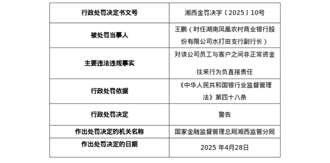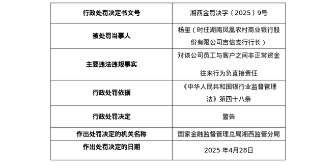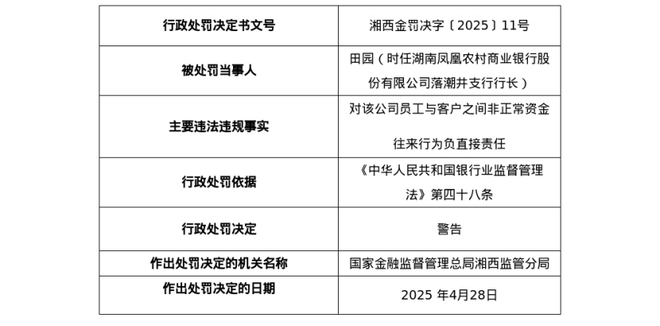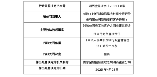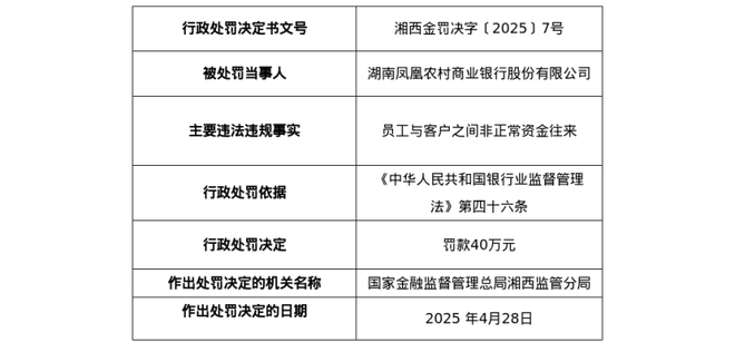 罚单显示,湖南凤凰农村商业银行股份有限公司的主要违法违规事实为:员工与客户之间存在非正常资金往来。国家金融监督管理总局湘西监管分局对其处以40万元罚款。