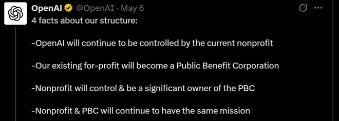 按照去年OpenAI发表的重组计划,其原本打算在未来继续保持非营利性组织和营利性组织兼而有之的状态。在这份已然“失败”的计划中,OpenAI现有的营利性组织将转变为特拉华州公共利益企业(PBC),非营利组织在现有营利性组织中的重大权益将以PBC的股票形式出现。