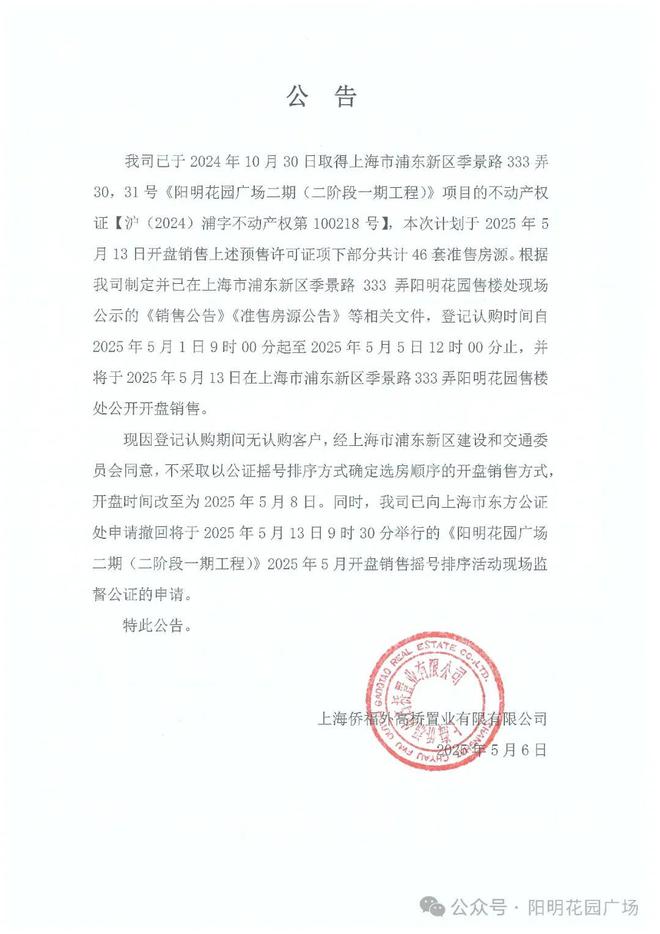 5月6日,阳明花园项目官微发布公告,因为期4天半的登记认购期间无认购客户,该项目取消公证摇号,改为8日上午直接开盘。