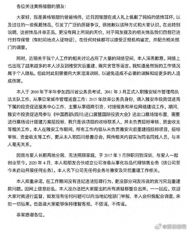 近日女演员黄杨钿甜佩戴230万耳环,父亲曾是公务员,引发网友热议。5月16日,黄杨爸爸发文称是黄杨钿甜爸爸,回应相关质疑称:为关于近日网络上引发的质疑争议和不实信息,我在此向大家进行说明。本人愿意接受大家的监督,也恳请大家能够保持理智客观,不信谣,不传谣。非常感谢各位。