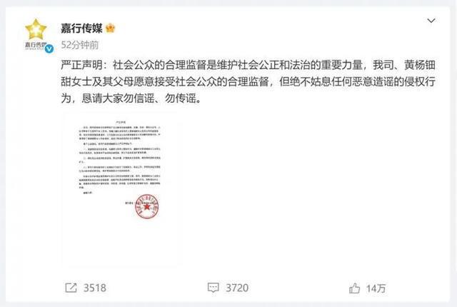 嘉行传媒发布严正声明,呼吁停止造谣等侵权行为,“社会公众的合理监督是维护社会公正和法治的重要力量,我司、黄杨钿甜女士及其父母愿意接受社会公众的合理监督,但绝不姑息任何恶意造谣的侵权行为,恳请大家勿信谣、勿传谣。”