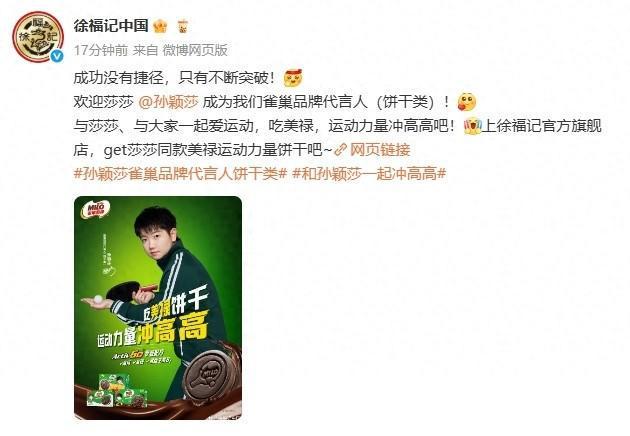 然而徐福记并未止步于此,5月15日,徐福记以一场“悬念官宣”引爆社交网络,官宣中国乒乓球运动员孙颖莎成为雀巢品牌代言人(饼干类),接着,“和孙颖莎一起冲高高”、“孙颖莎不断超越自我”、“孙颖莎坚持热爱追逐信仰”等互动话题也登上微博热搜。