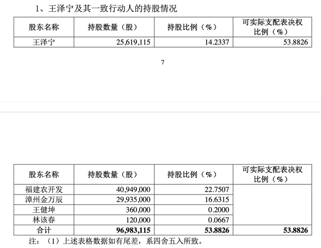 关系解除后,王泽宁、福建农开发、漳州金万辰以及王泽宁的近亲属王健坤(王泽宁之父)及林该春(王泽宁之母)仍构成一致行动关系,合计持有公司53.8826%的股份。万辰实控人则由王泽宁、王丽卿、陈文柱变更为王泽宁。