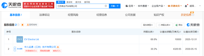 天眼查App显示,5月22日,江苏高合汽车有限公司成立,法定代表人为Jihad Mohammad,注册资本约1.43亿美元,经营范围包括道路机动车辆生产、汽车零部件研发、工程和技术研究和试验发展等,由EV Electra Ltd.和华人运通(江苏)技术有限公司共同持股。