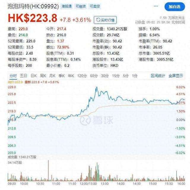 港股泡泡玛特午后持续走高,一度涨超6%,截至收盘涨幅3.61%,股价继续刷新历史新高,总市值已突破3000亿港元。