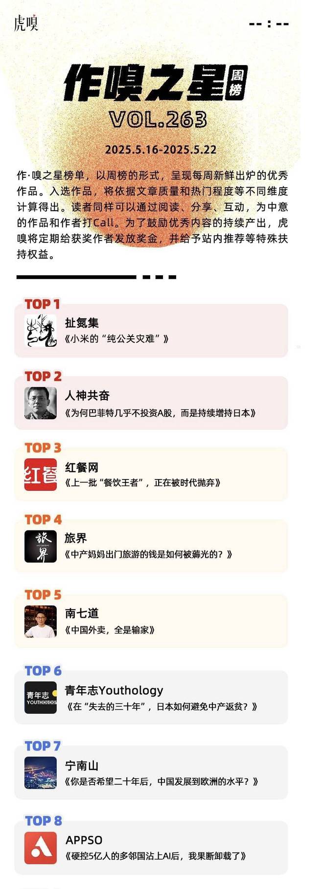 作·嗅之星榜单,以周榜的形式,呈现每周新鲜出炉的优秀作品。2025年5月16日~2025年5月22日,虎嗅第263期,作·嗅之星的获奖文章分别是: