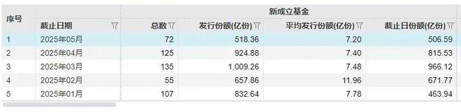 截至5月26日,新成立基金数量仅72只,总发行份额为518.36亿份,平均发行份额为7.2亿份,平均发行份额与近三个月数据持平,但该月目前总发行份额已明显落后前一个月。