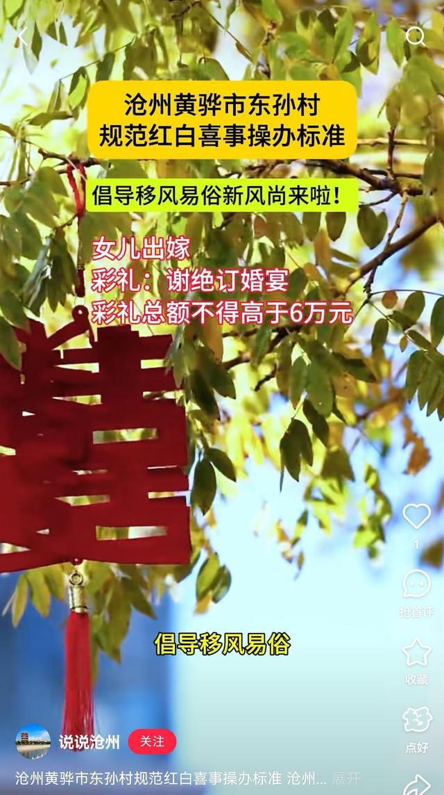 极目新闻记者 张皓近日,网上传出《东孙村关于规范红白喜事操办标准的通知》,其中规定:谢绝订婚宴,彩礼最高6万元,“改口费... 极目新闻记者 张皓