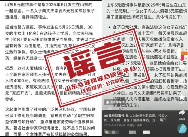 据山东互联网联合辟谣平台5月29日消息,近日,网传一则关于“山东一名女子向丈夫索要5元钱买煎饼果子当早餐遭拒后,选择喝药轻生”信息。经向省内各地和有关部门核实,网传信息不实。