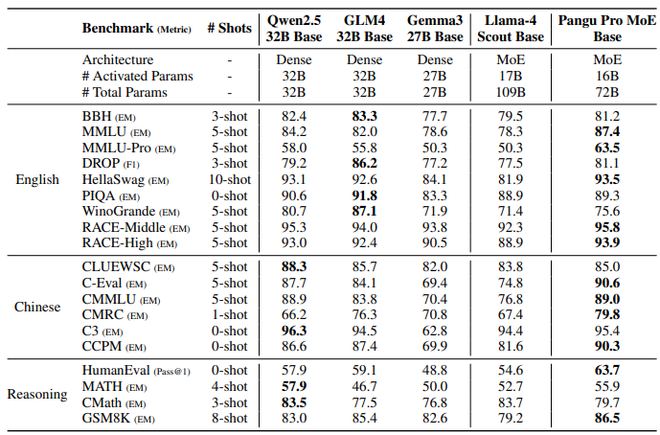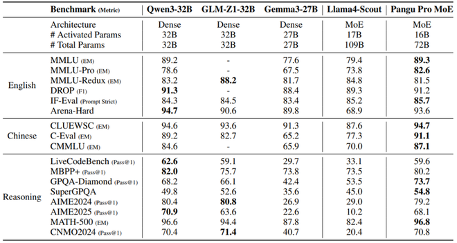 对比基线选取同规模前沿模型,包括开源的稠密模型 Qwen3-32B、GLM4-Z1-32B)及 MoE 模型(Llama4 Scout),盘古 Pro MoE 在复杂推理任务上展示出同规模最优的性能。