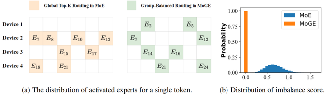 如下图所示,子图 (a) 展示了在专家并行度 (EP)=4 时,从 24 个专家池中选取 8 个专家的激活专家分布对比;子图 (b) 则呈现了传统 MoE 和本文所提 MoGE 两种路由机制下估计的不平衡分数分布,其中分布估计的参数设定为 N=64(总专家数)、K=8(单 token 选择专家数)、M=8(组数)、∣X∣=16(输入序列长度)。