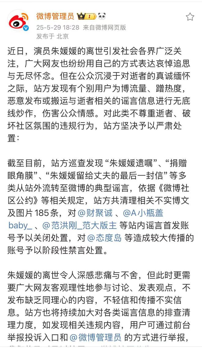 截至目前,站方巡查发现“朱媛媛遗嘱”、“捐赠眼角膜”、“朱媛媛留给丈夫的最后一封信”等多类从站外流转至微博的典型谣言,依据《微博社区公约》等相关规定,站方共清理相关不实博文及图片185条,对@财聚诚 、@A小瓶盖baby_ 、@范洪刚_范大版主 等站内谣言首发账号予以关闭处置,对@态度岛 等造成较大传播的账号予以阶段性禁言处置。